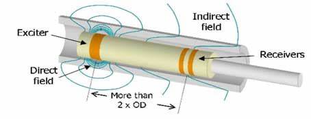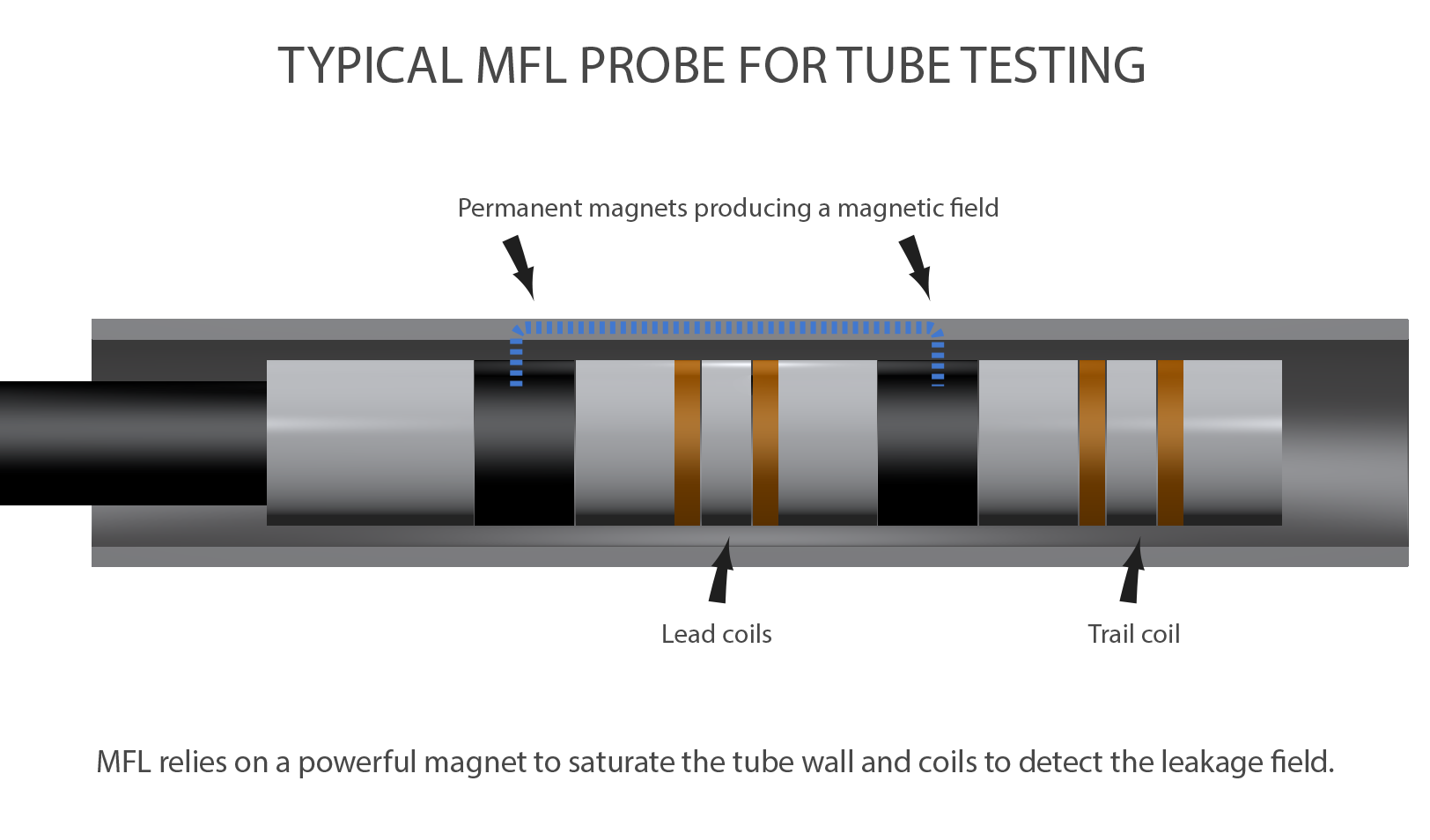 MFL detects internal pitting and corrosion using a strong magnetic field. If there is metal loss or cracking, the magnetic field leaks, which can be detected and analyzed.